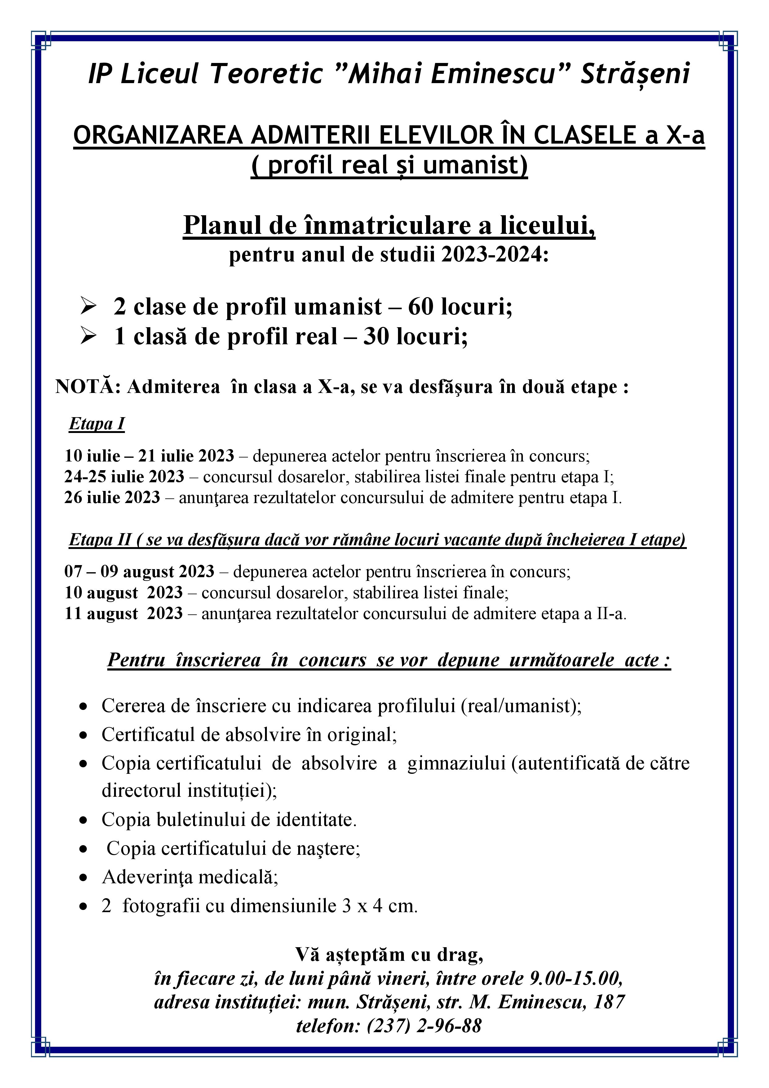 Organizarea admiterii elevilor în clasele a X-a (profil real și umanist)